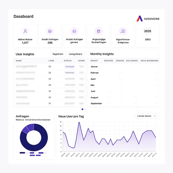 Mit AdsEngine erhältst du datenbasierte Einblicke in Impressionen, Klicks, Kosten, Conversions und ROI – alles in Echtzeit.